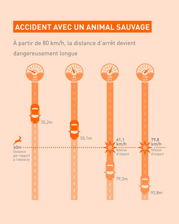 - Adapter sa vitesse : Ralentir dans les zones signalées « passage d’animaux » augmente le temps de réaction. À 60 km/h, la distance de freinage est de 35,2 m, contre près de 80 m à 100 km/h.